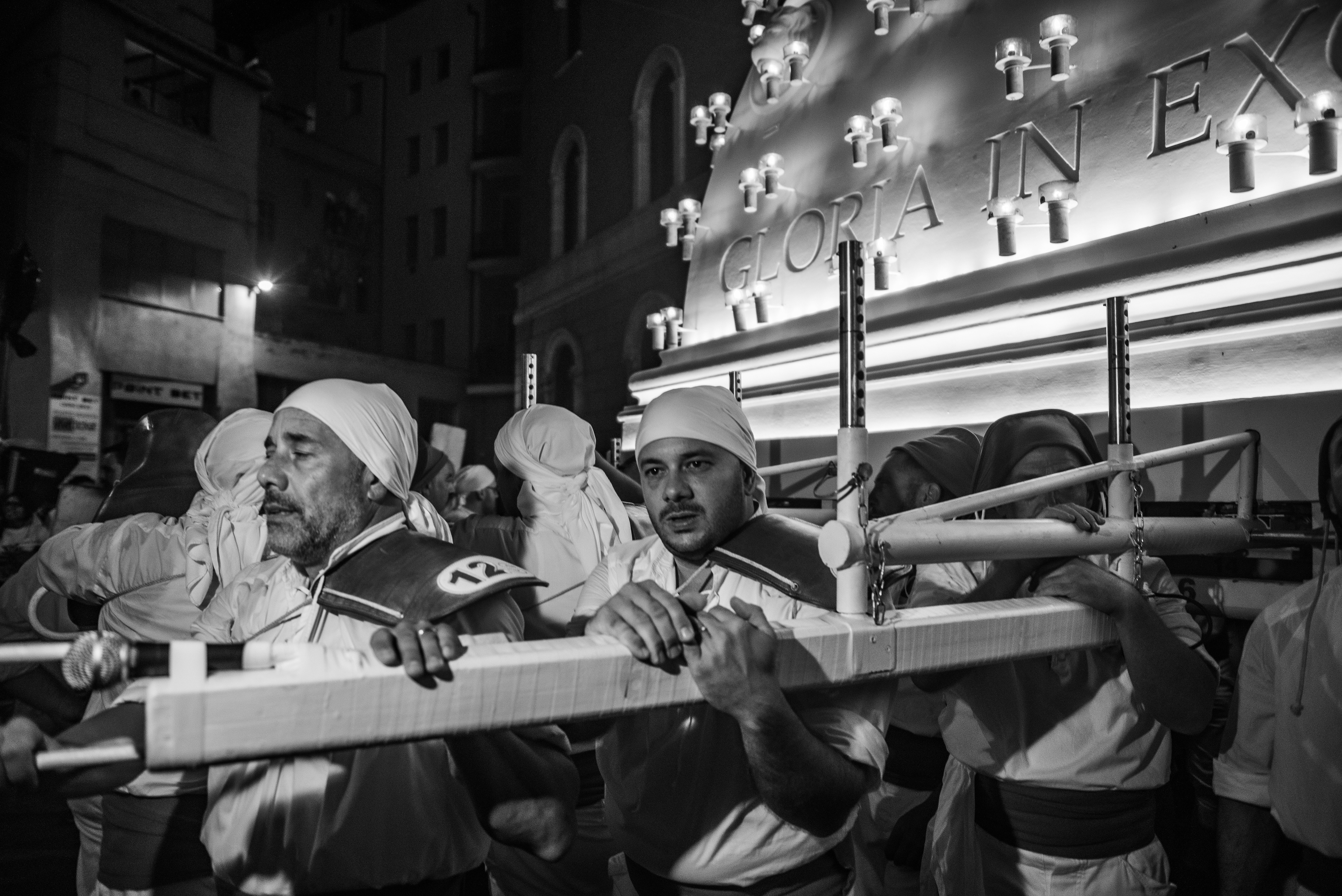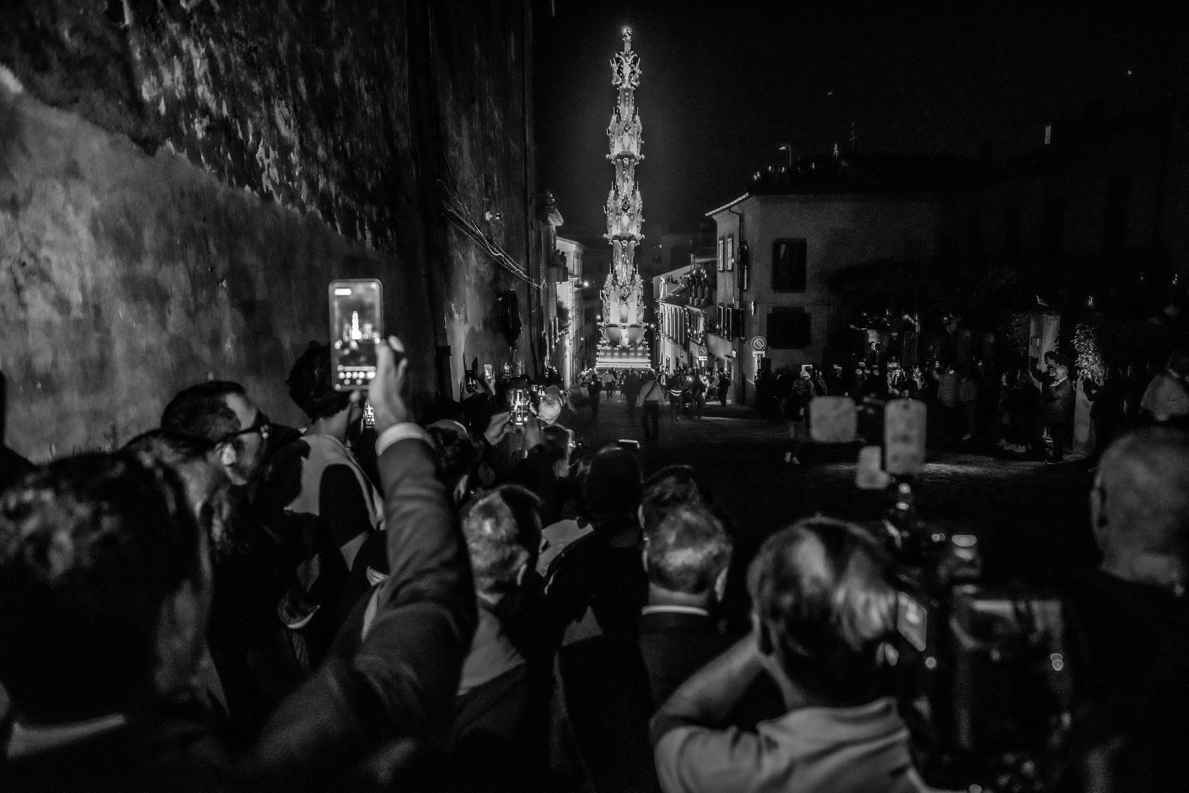 Every year on September 3rd the city of Viterbo celebrates the Transport of the Macchina di Santa Rosa, a monumental tower carried through the streets by the Facchini, a group of men who shoulder the structure during a night procession rooted in centuries of devotion.Working from within the crowd and close to the porters, my photographs focus on the human dimension of the ritual — the physical effort, the coordination and the shared energy that transform the city into a collective act of faith.